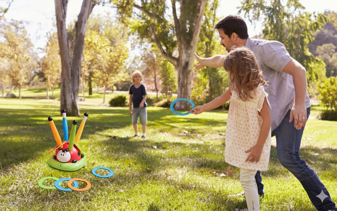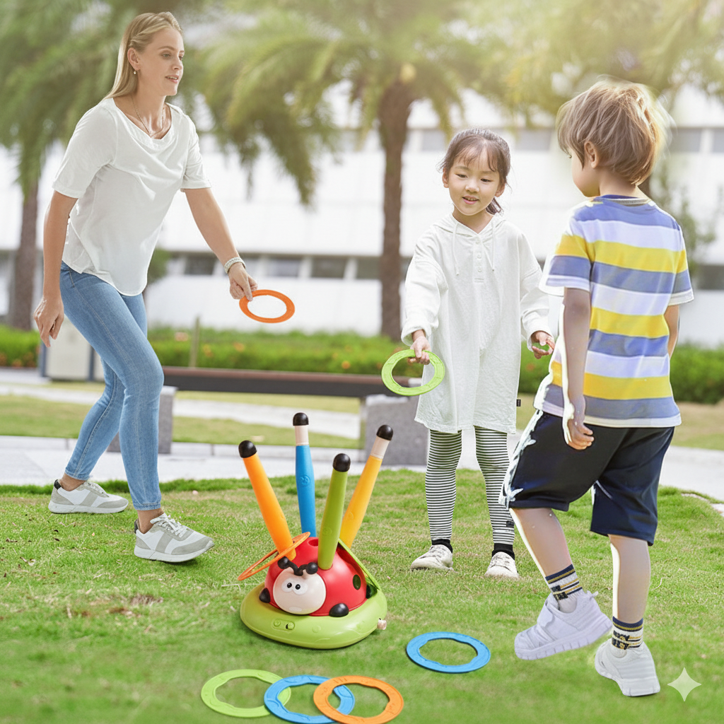 2) Modo Lanzamiento de Anillos La mariquita gira y el objetivo se mueve… El niño intenta encestar los anillos → perfecto para desafíos entre varios jugadores.