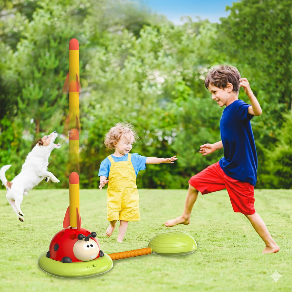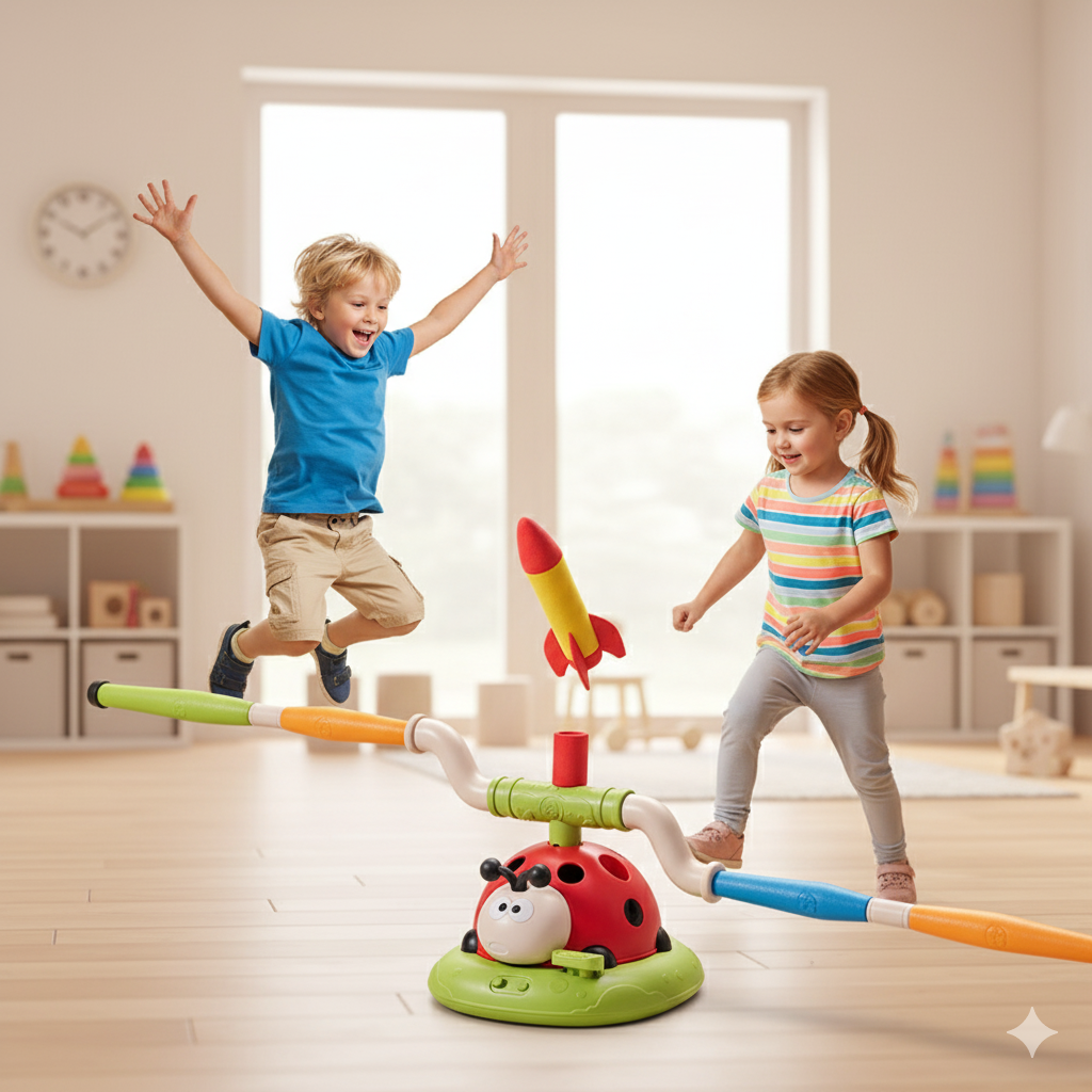 ¡Diversión que pone a los niños en movimiento! Música, saltos, anillos y cohetes… ¡un solo juguete, tres veces más diversión!